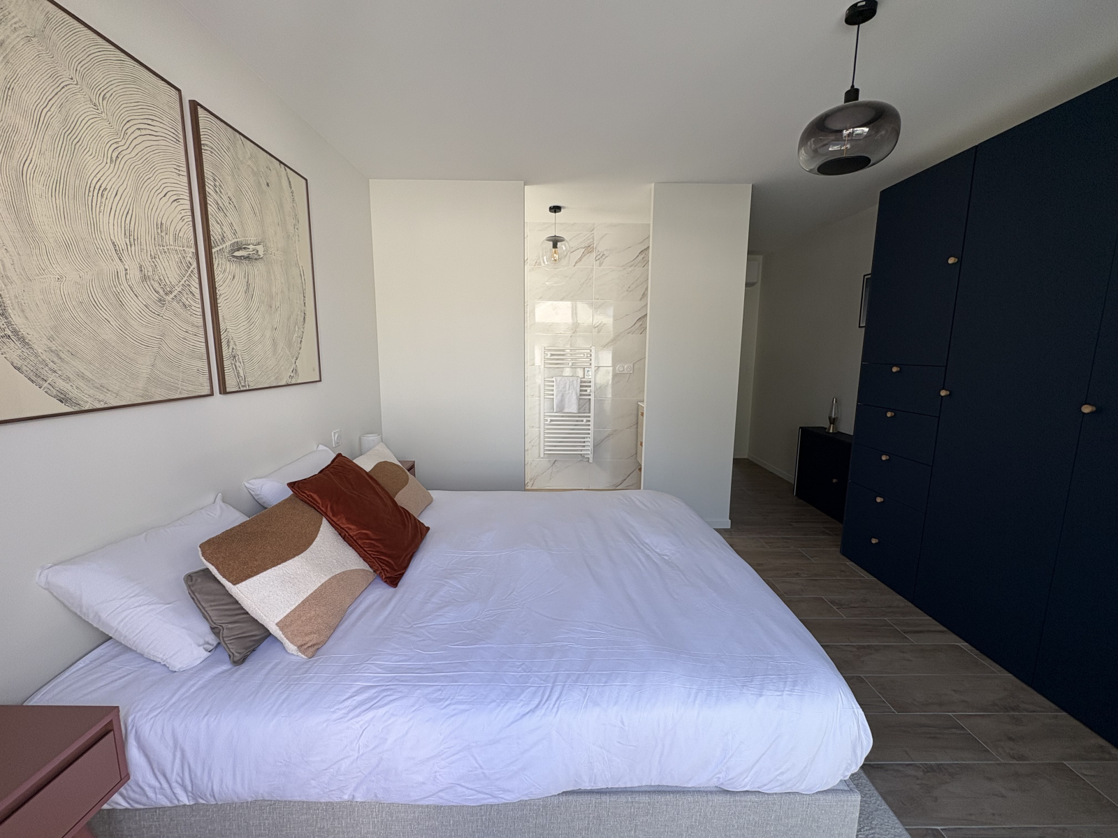 Je me présente, je mesure 103 m2 et bénéficie d'une luminosité dans toutes les pièces. Je dispose d'une entrée avec placard, d'un séjour ouvert sur une terrasse de plus de 44 m2 et un jardin intime, d'une cuisine équipée, d'un cellier, d'une chambre parentale de 17,32 m2 avec salle d'eau, de 2 autres chambres avec placards, d'une seconde salle d'eau et d'un wc. avec lave-mains.
