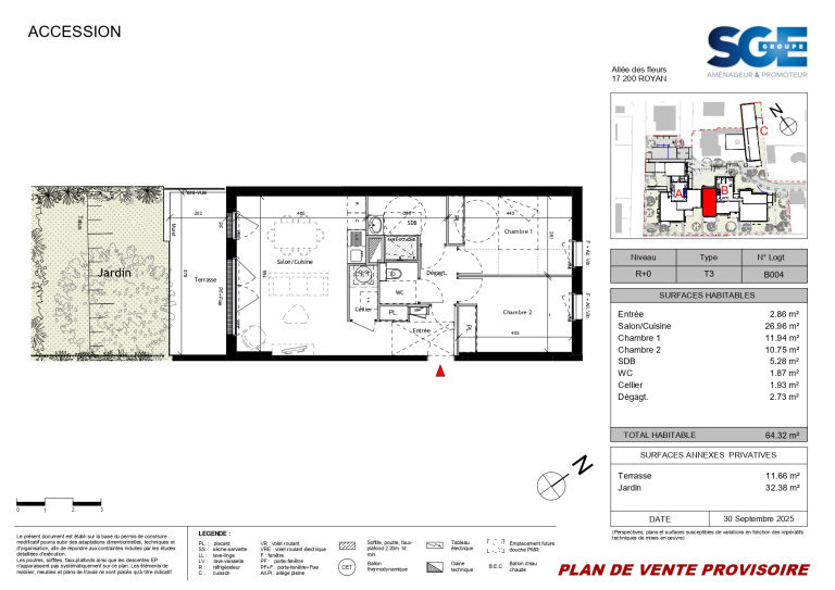 Découvrez cet appartement T3 de 64,32 m², exposé plein sud, situé dans Le Jardin des Vagues, une résidence neuve intimiste et élégante, à quelques mètres à pied de la plage du Pigeonnier – emblème discret et chic de la côte royannaise – et à proximité immédiate de la vibrante plage de Pontaillac.