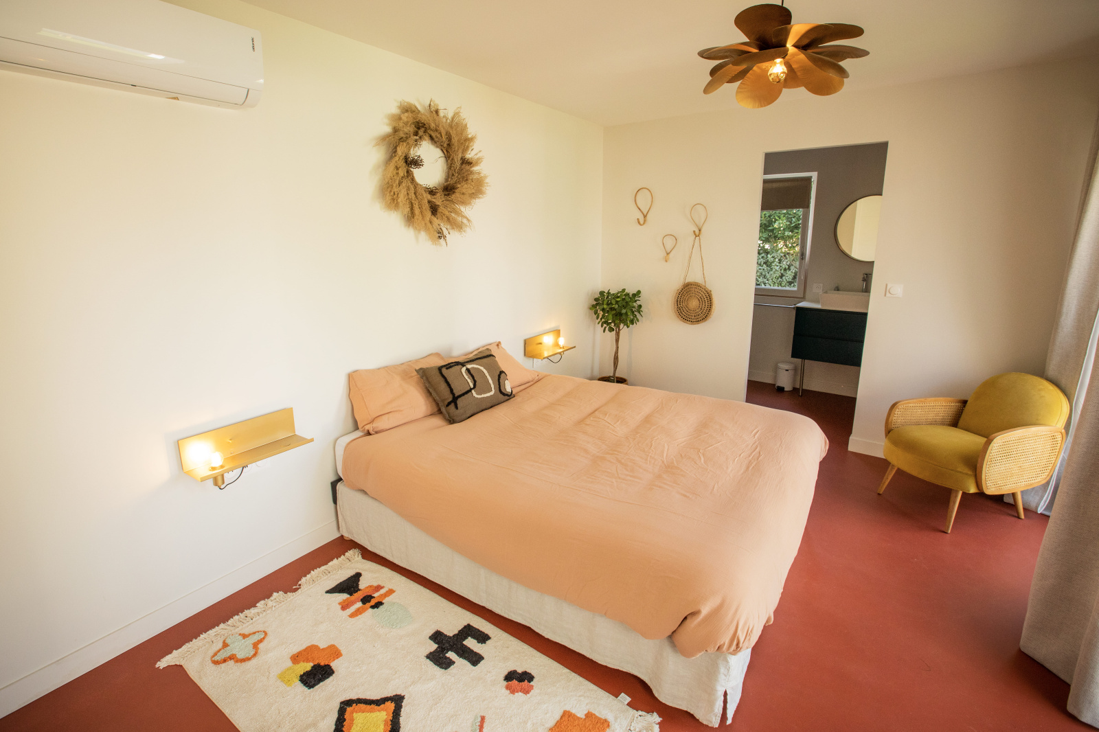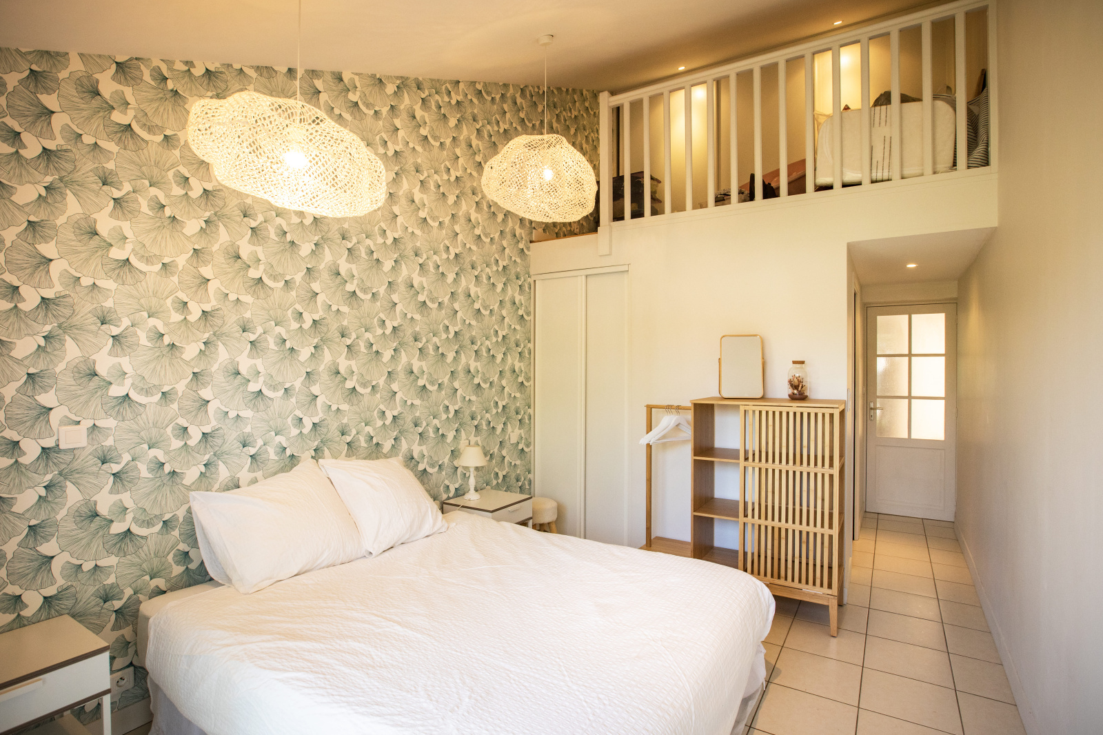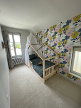 Je veille aussi sur votre repos : toujours au rez-de-chaussée, ma suite parentale vous offre un espace intime avec sa chambre dotée d’un placard accompagné d'une mezzanine, ainsi qu’une salle d’eau privative avec WC.