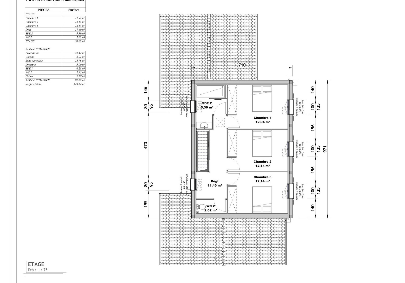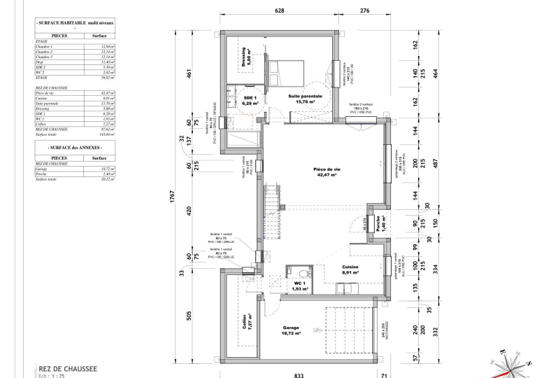 Elle se compose en son RDC : d'une belle pièce de vie de plus de 51 m2 avec sa cuisine à imagnier, d'une véritable suite parentale de 27,04 m2 comprenant salle d'eau et dressing, d'un WC et d'un cellier.
